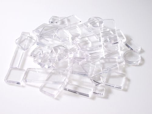 Acryl-Mosaik besteht aus transparentem Kunststoff. Durch die Vielzahl an Formen lassen sich beliebige Muster erstellen. Neben Quadraten und Rechtecken in unterschiedlichen Größen sind Kreise, Dreiecke, Sechsecke und unregelmäßige Formen vorhanden. Durch seine Transparenz ist dieses Material auch sehr gut für hinterleuchtete Mosaike geeignet!