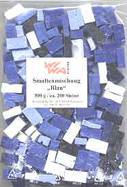 Die Smalten-Mischung Blau beinhaltet etwa 500 g hochwertiges Material. Die Steine sind in etwa zehn verschiedenen Farbtönen (Blautöne) gehalten und haben eine Größe von etwa 10 x 15 mm. Die Stärke beträgt 6 bis 8 mm. 500 g Verpackungseinheit entsprechen etwa 200 Steinen, die eine Fläche von 22 x 16 cm ergeben.