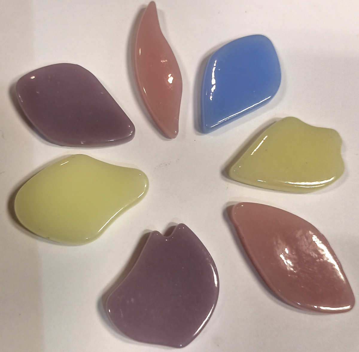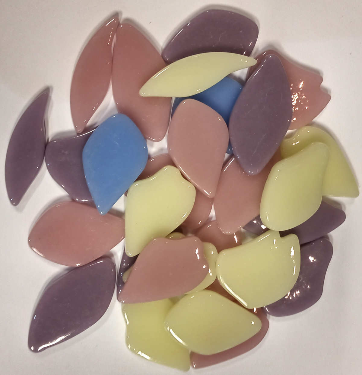 Die Blüten bestehen zu 98% aus Recycling-Glas und haben weiche, abgerundete Kanten. Sie lassen sich wunderbar mit allen 4mm dicken Mosaiksteinchen, wie z.B. unserem Mini-Flip-Keramik kombinieren.