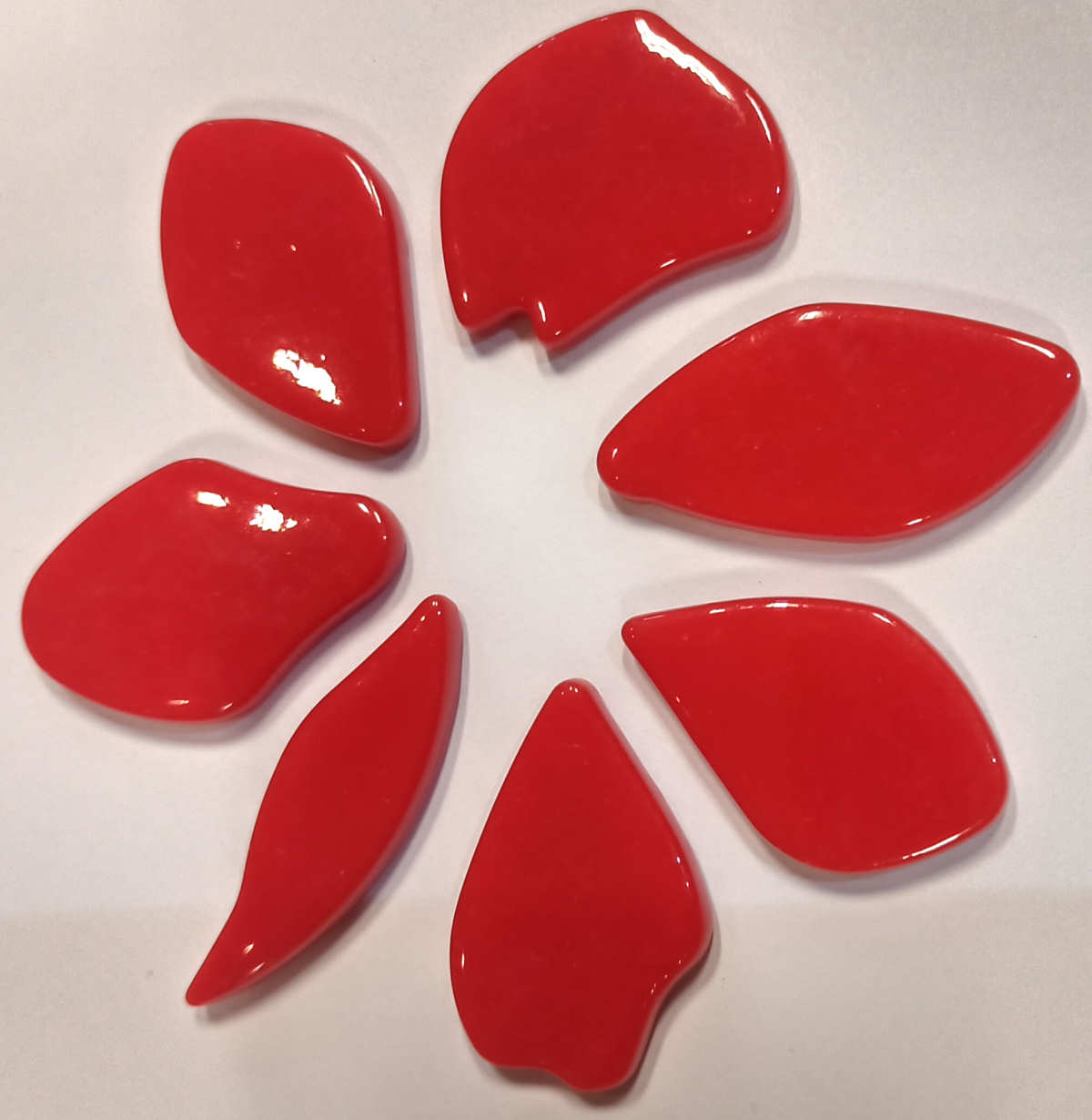 Die Blüten bestehen zu 98% aus Recycling-Glas und haben weiche, abgerundete Kanten. Sie lassen sich wunderbar mit allen 4mm dicken Mosaiksteinchen, wie z.B. unserem Mini-Flip-Keramik kombinieren.