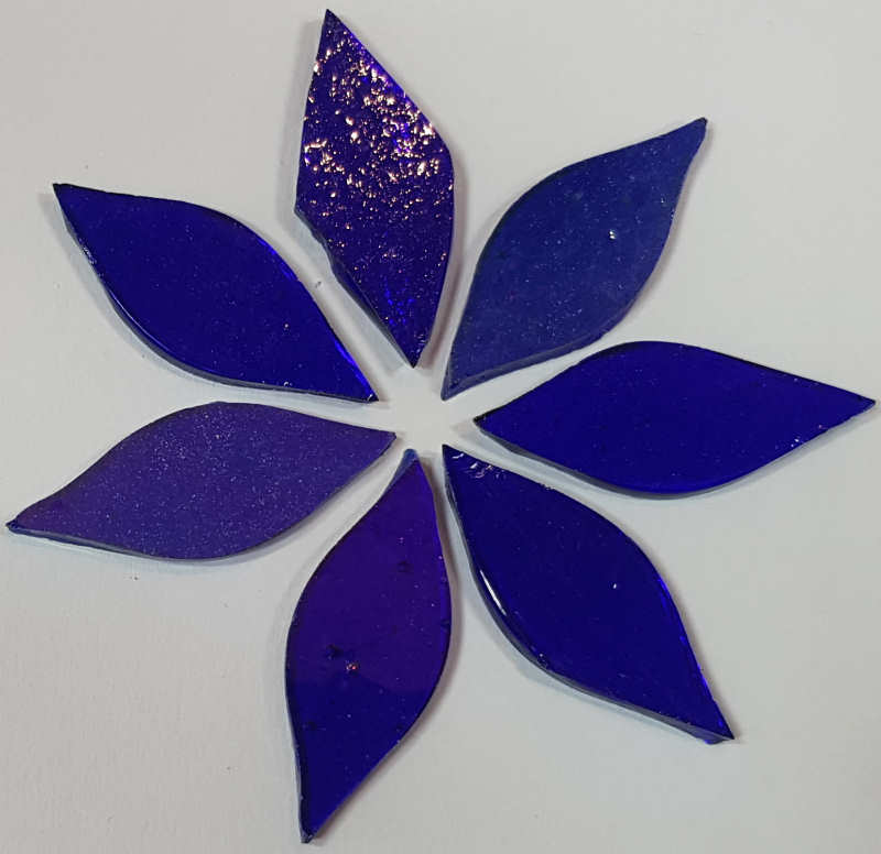 Die Blüten sind teilweise transparent, teilweise mit schöner irisierender Oberfläche und eignen sich auch für hinterleuchtete Mosaike wie z.B. Teelichter, Vasen etc. Das Tiffany-Glas ist beidseitig verwendbar. Die Vorderseite kann sich von der Rückseite farbtechnisch auch unterscheiden, dies liegt in der Natur der Tiffany-Gläser.