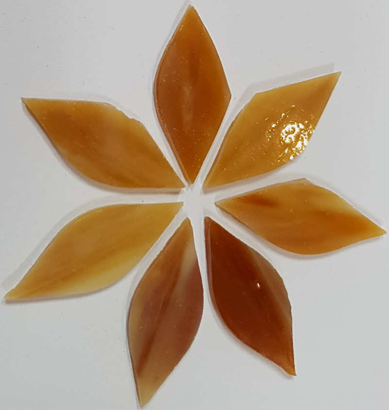 Die Blüten sind teilweise transparent, teilweise mit schöner irisierender Oberfläche und eignen sich auch für hinterleuchtete Mosaike wie z.B. Teelichter, Vasen etc. Das Tiffany-Glas ist beidseitig verwendbar. Die Vorderseite kann sich von der Rückseite farbtechnisch auch unterscheiden, dies liegt in der Natur der Tiffany-Gläser.