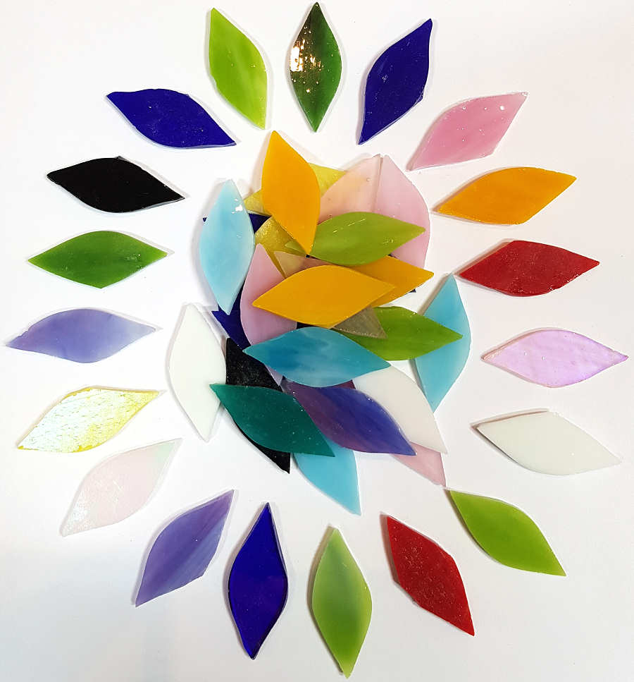 Die Blüten sind teilweise transparent, teilweise mit schöner irisierender Oberfläche und eignen sich auch für hinterleuchtete Mosaike wie z.B. Teelichter, Vasen etc. Das Tiffany-Glas ist beidseitig verwendbar. Die Vorderseite kann sich von der Rückseite farbtechnisch auch unterscheiden, dies liegt in der Natur der Tiffany-Gläser.