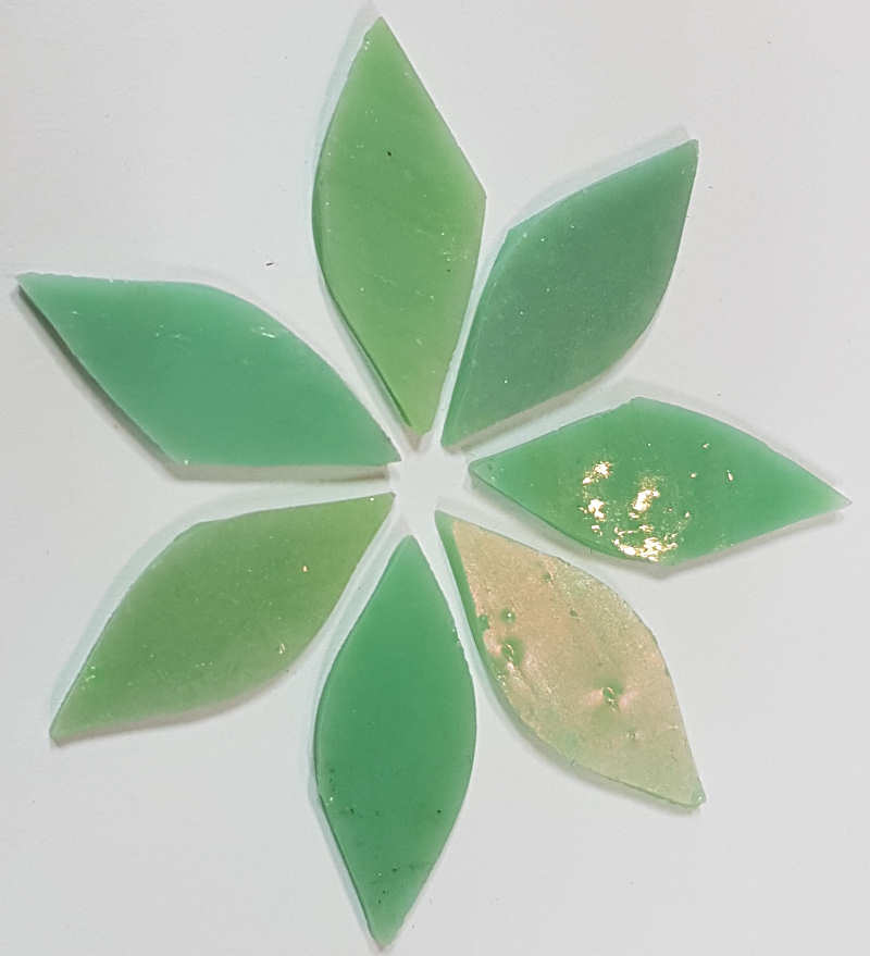 Die Blüten sind teilweise transparent, teilweise mit schöner irisierender Oberfläche und eignen sich auch für hinterleuchtete Mosaike wie z.B. Teelichter, Vasen etc. Das Tiffany-Glas ist beidseitig verwendbar. Die Vorderseite kann sich von der Rückseite farbtechnisch auch unterscheiden, dies liegt in der Natur der Tiffany-Gläser.