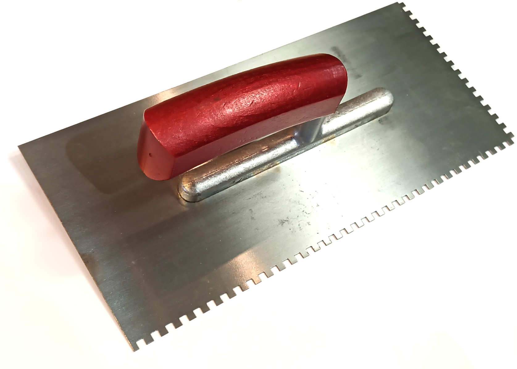 Diese Zahnspachtel ermöglicht eine gleichmäßige Verteilung des Klebers auf dem zu beklebenden Untergrund. Bei kleineren Mosaiksteinen, insbesondere beim Arbeiten in der indirekten Methode, empfiehlt sich das anschließende Glätten des Kleberbetts.